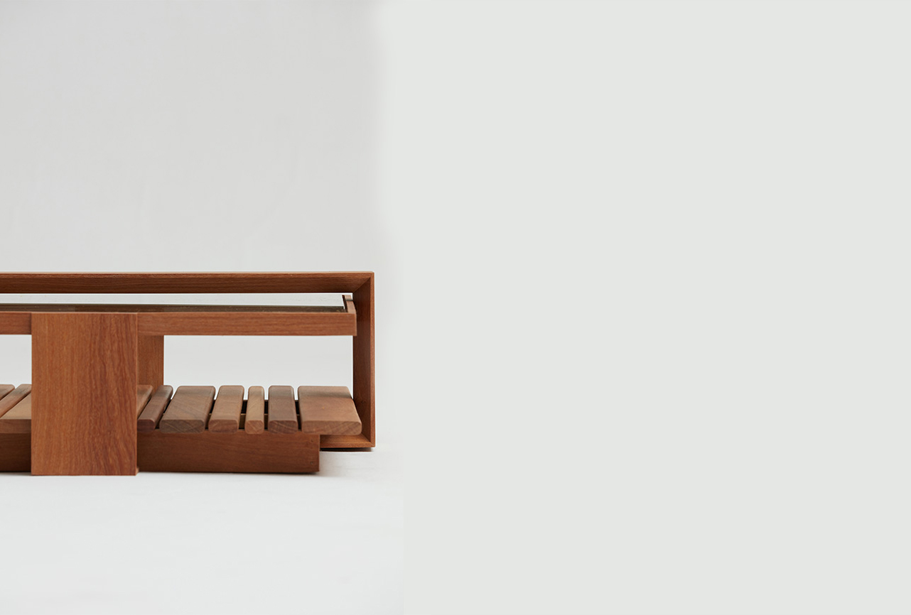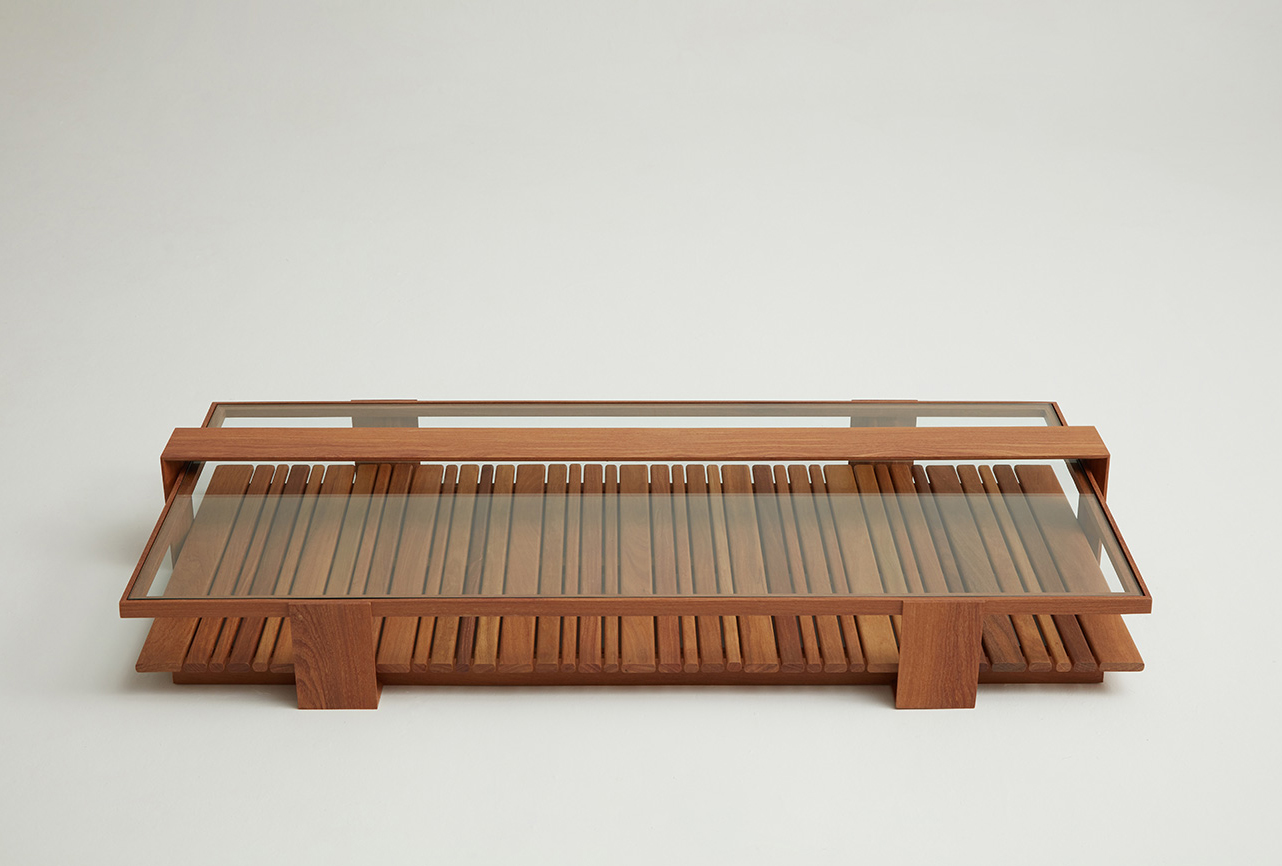 Mesa centro Pilar, estructura de madera de cumarú, tapa de cristal templado.
