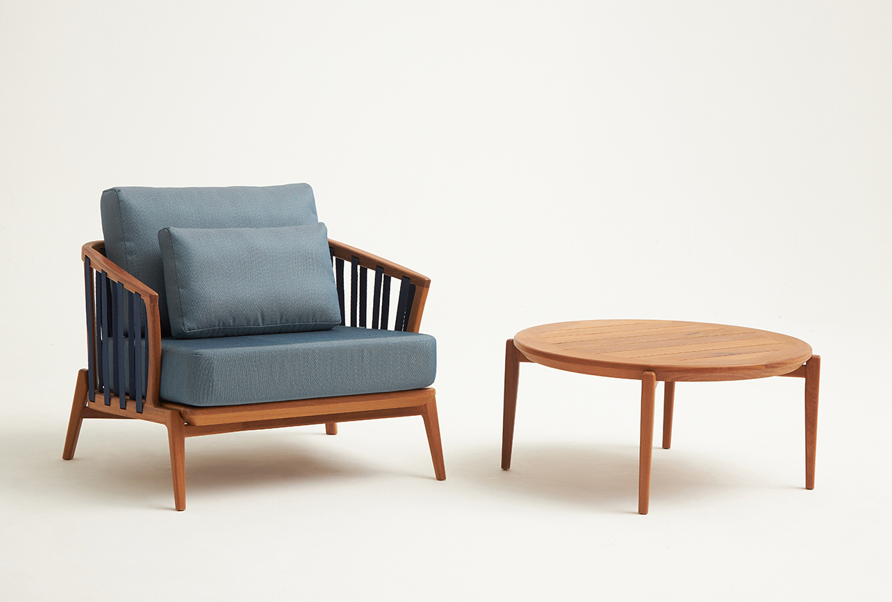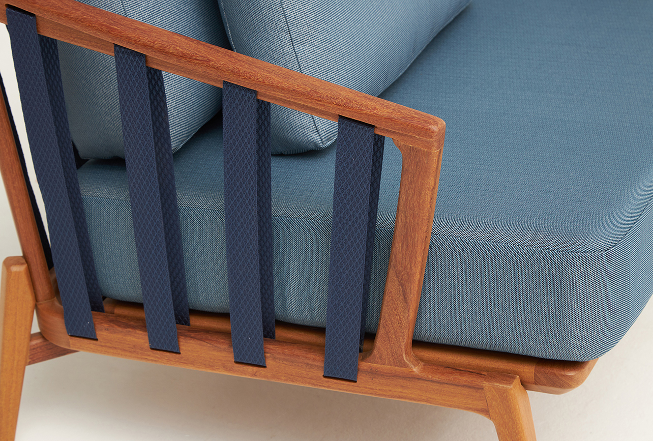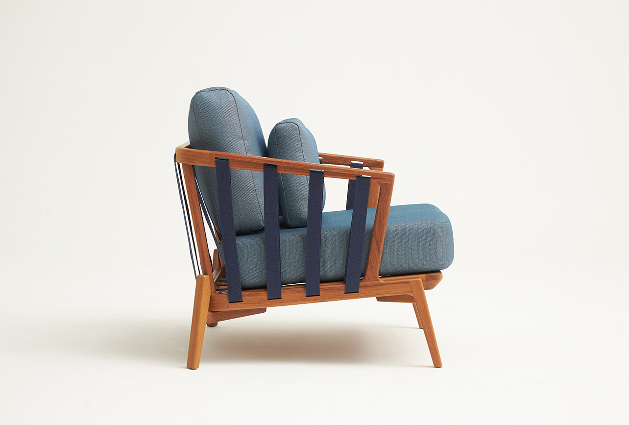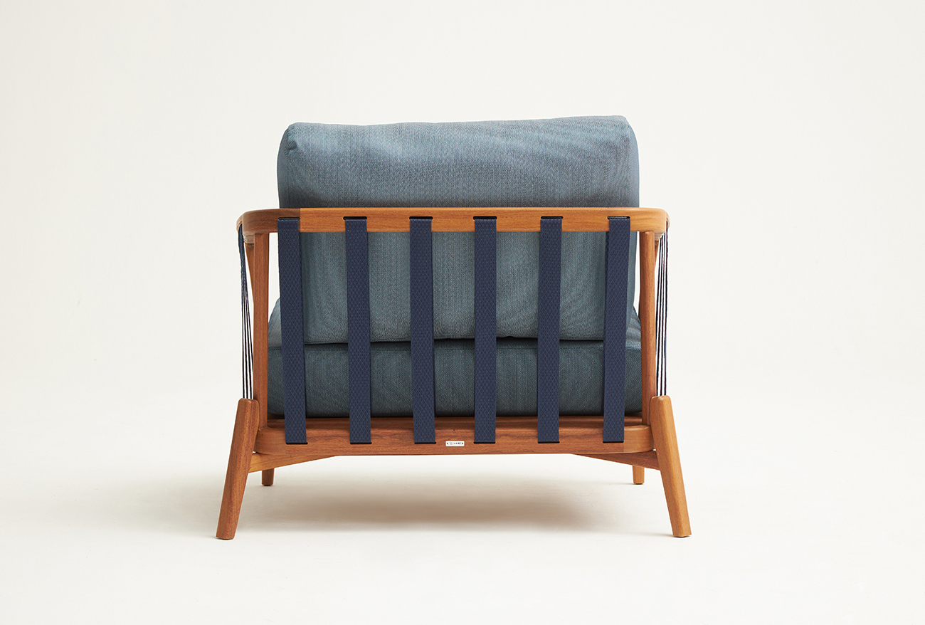 Sillón Hibisco, estructura de madera de cumarú, cinta náutica y cojín de tela.