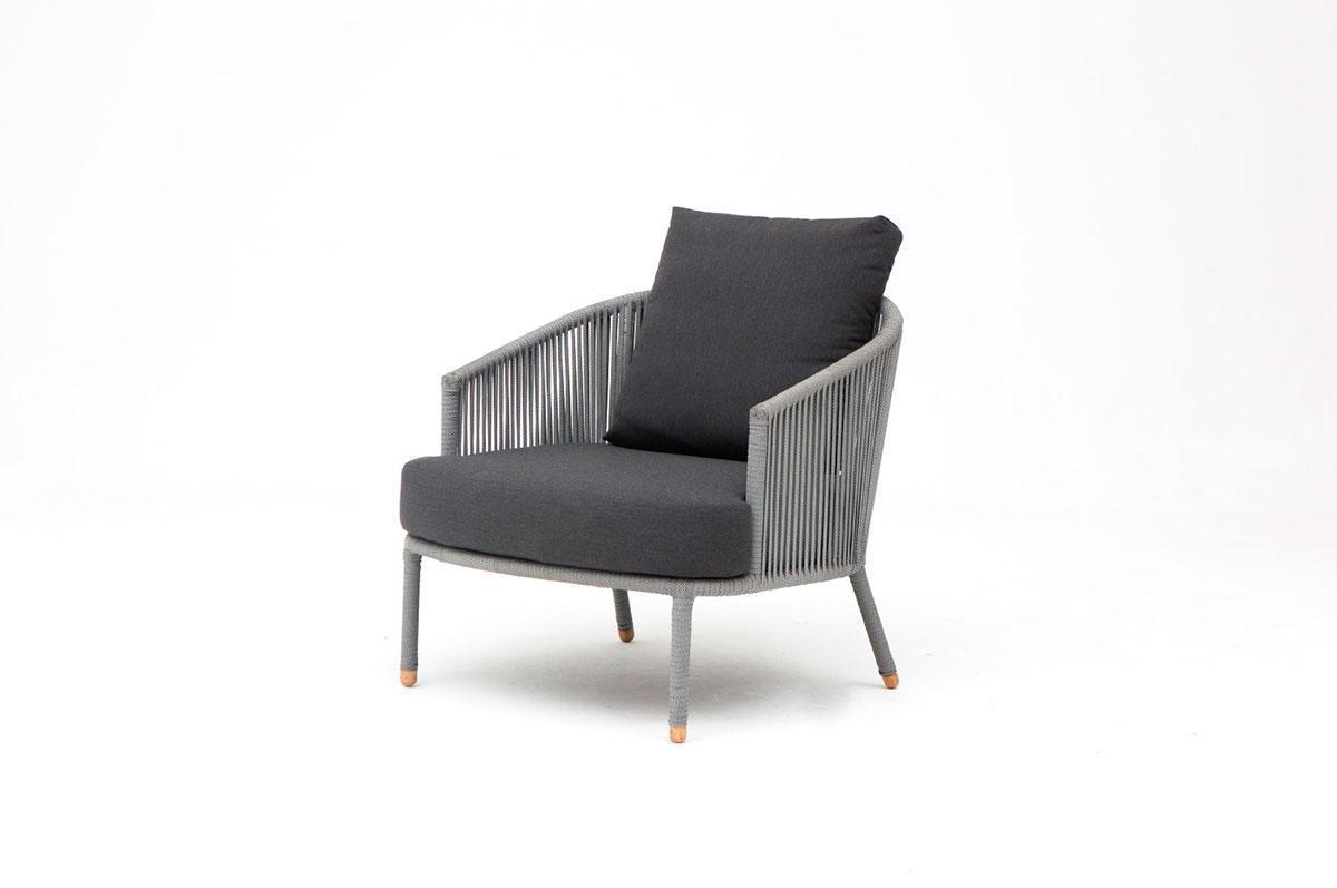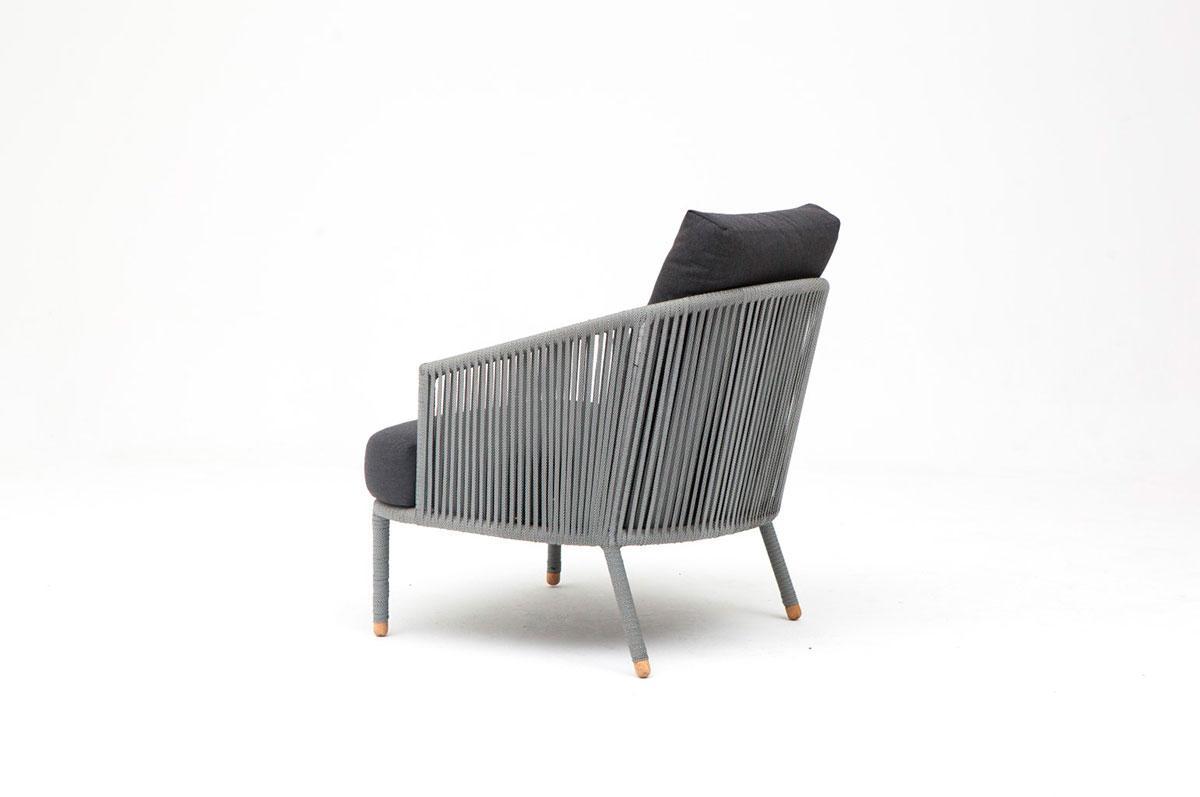 Estructura de aluminio y cuerda con asiento y respaldo tapizados en tejido.
