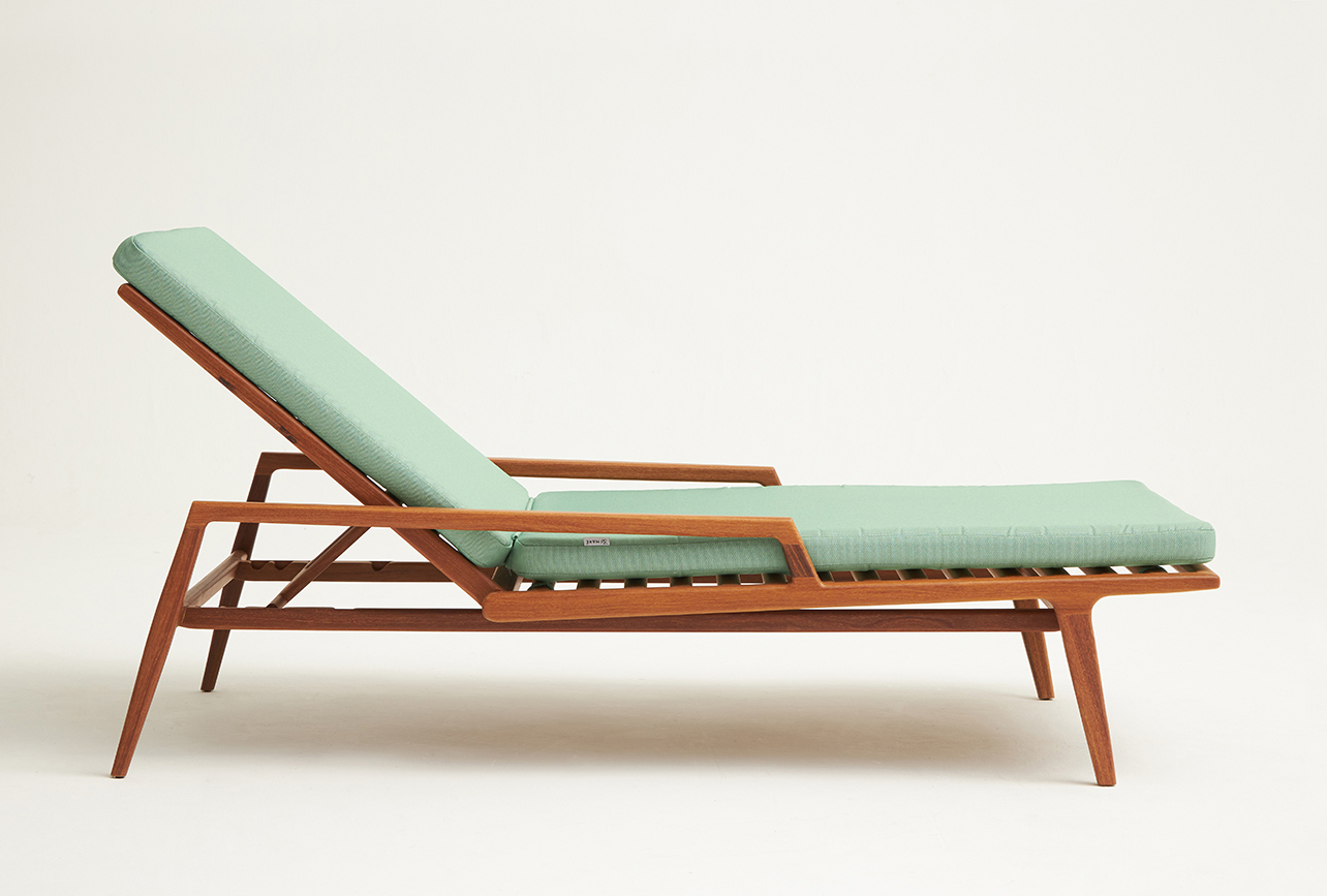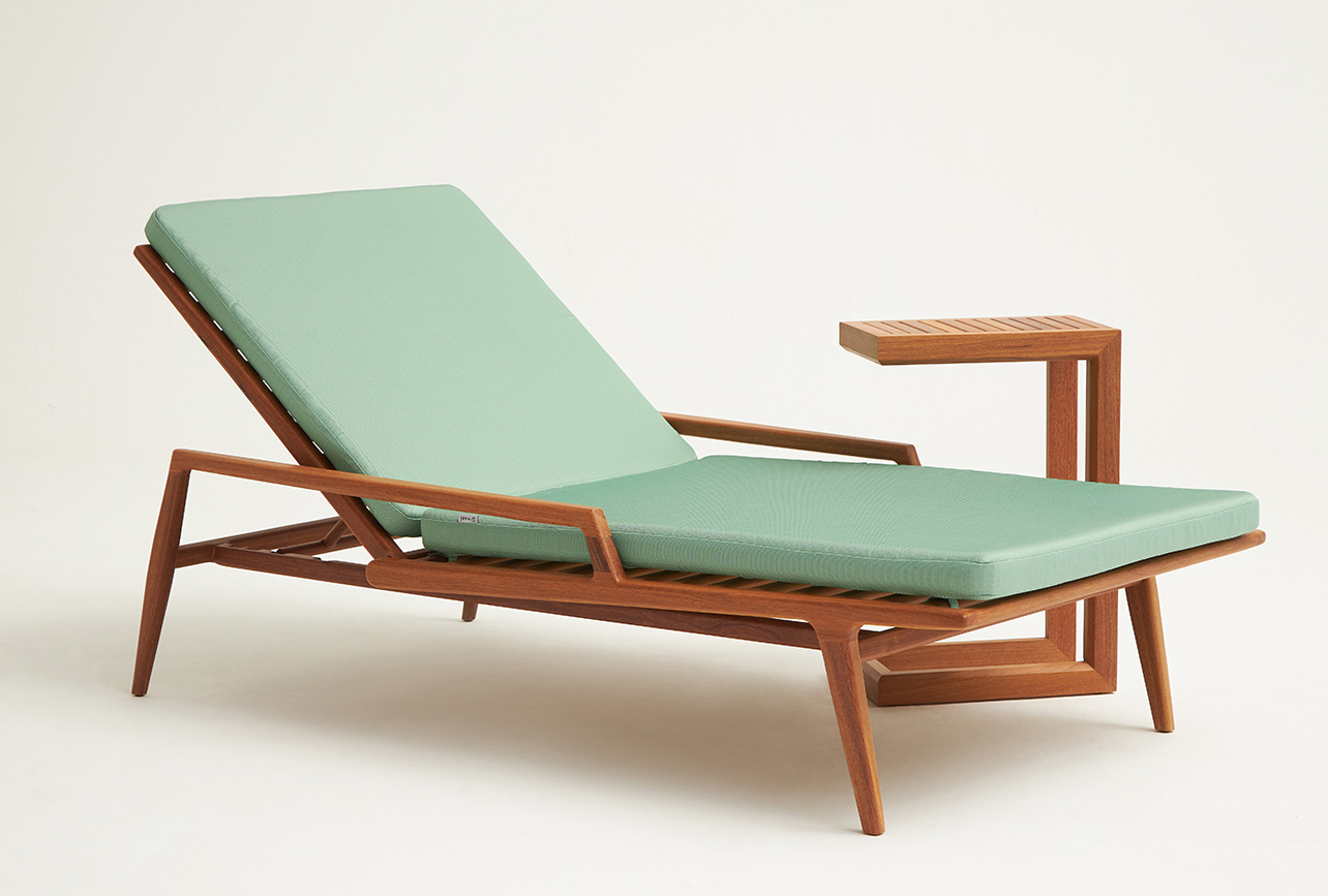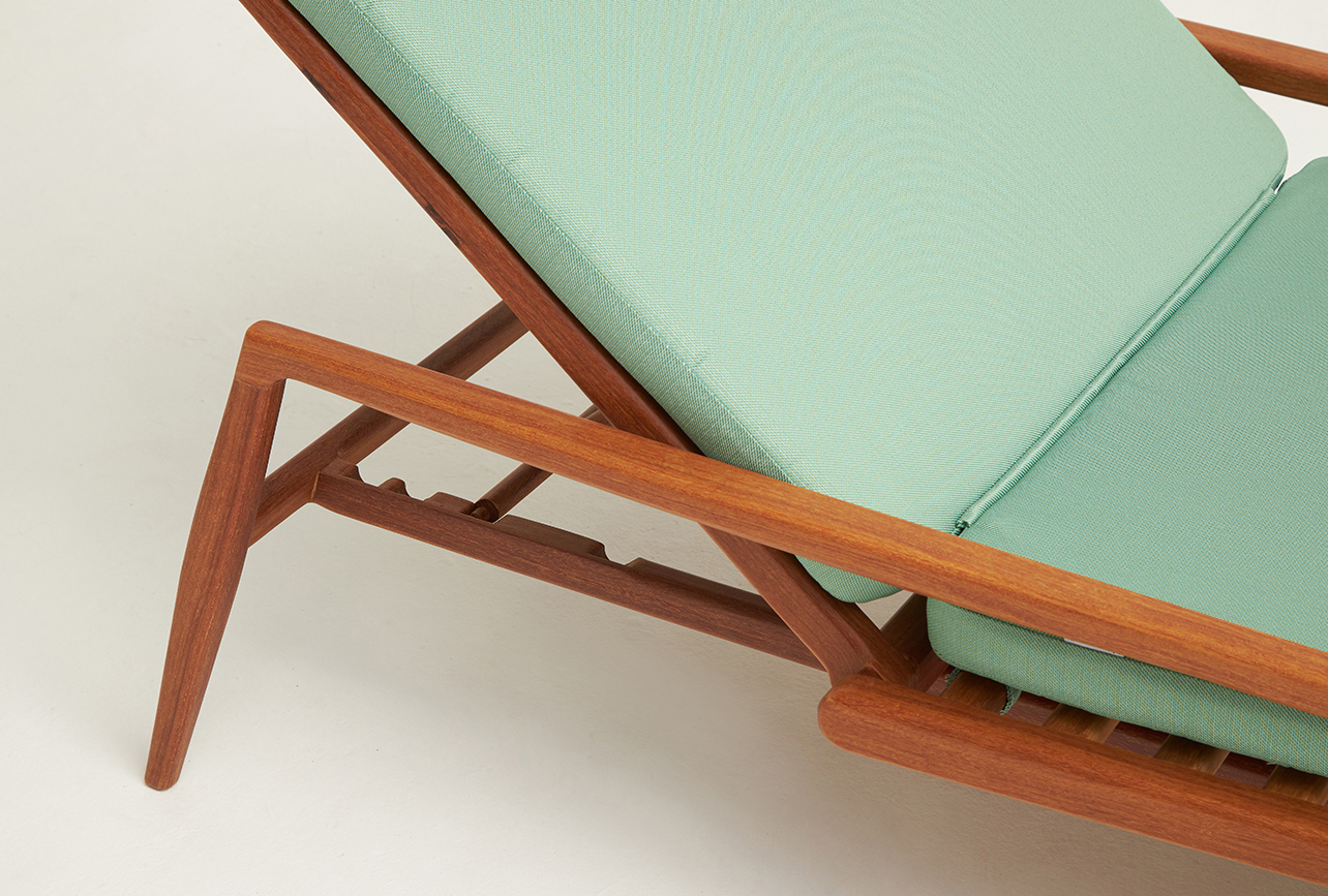Tumbona Irere, estructura de madera de cumarú con cojines.