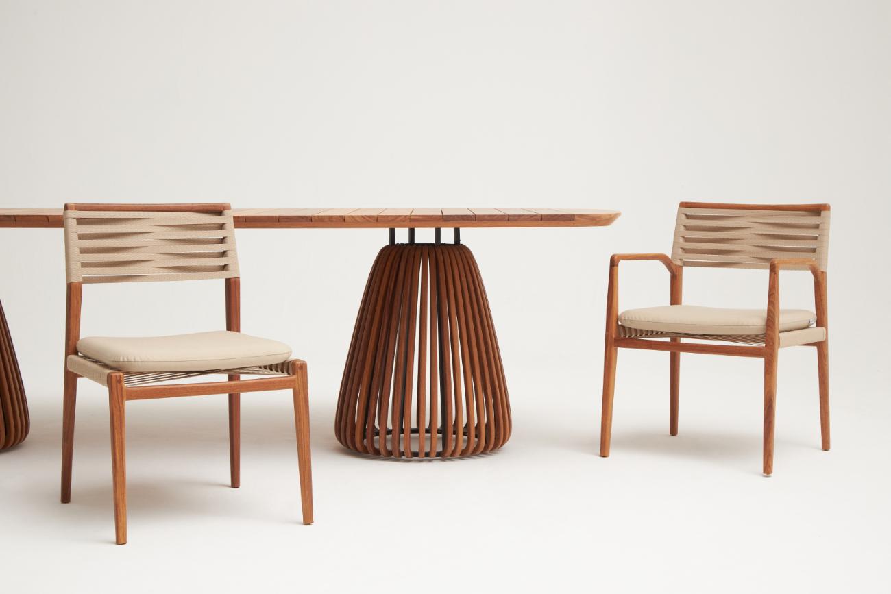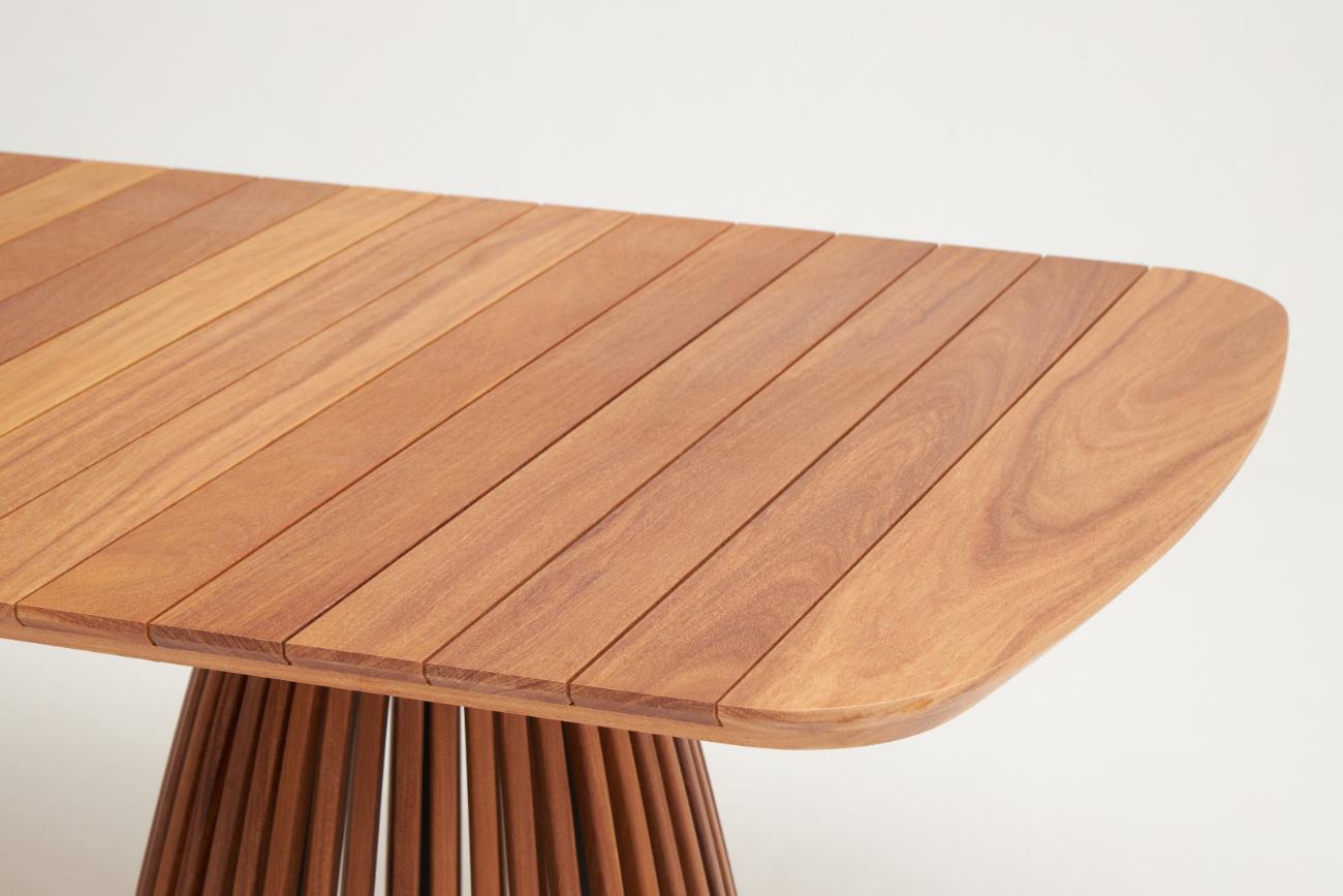 Inspirada en las formas redondeadas de esta ballena, está construida con perfiles de madera colocados uno al lado del otro formando un circulo, formando e volumen de la base. La tampa esta construida con lamas anchas, y presenta los cantos biselados, para mayor ligereza del conjunto.