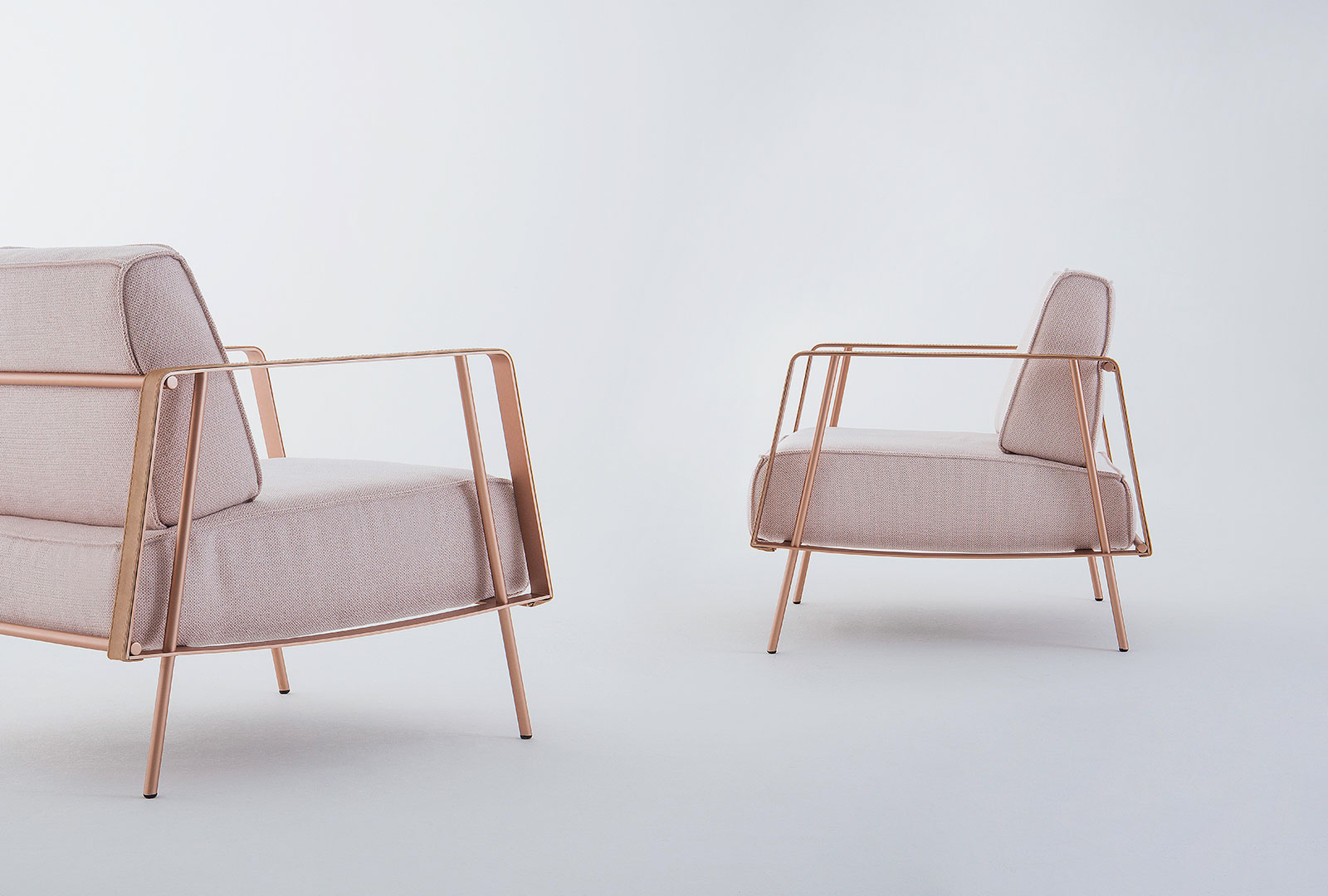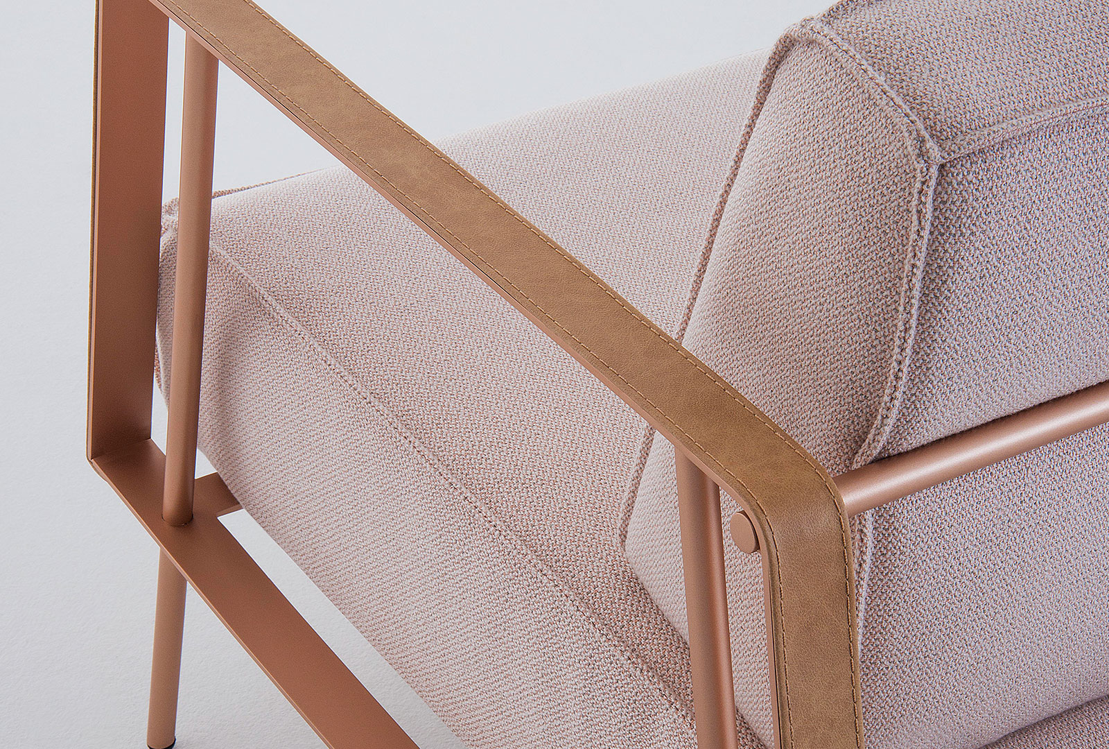 Sillón elegante, con base de metal pintado y brazos con aplicación de cuero reconstituido.